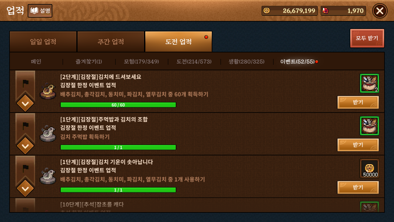 이제 김치 받고 먹어서 금전이랑 상급재료 보상 챙기면 김장절 이벤트도 끄읏~