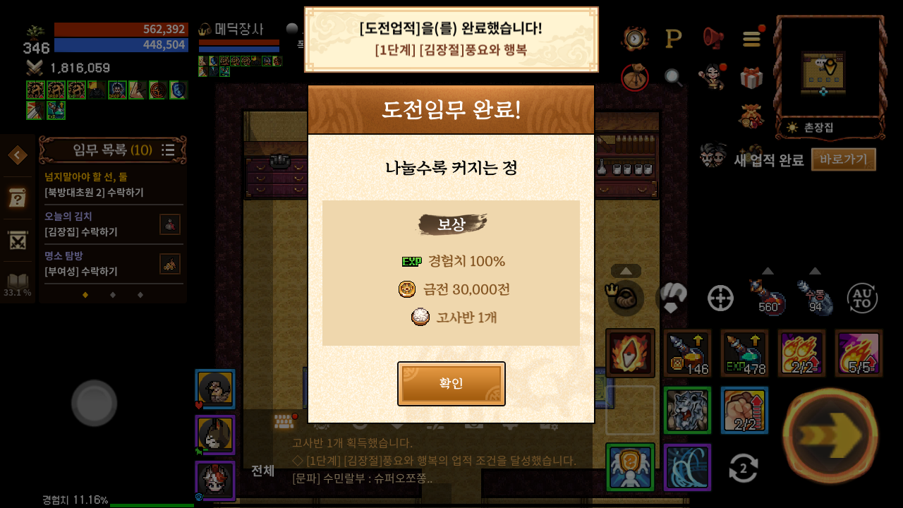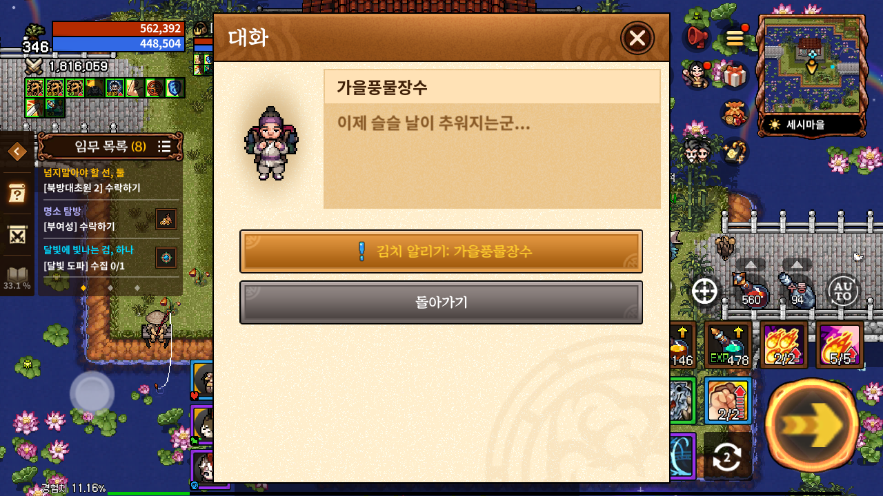 개성댁아주머니께 김치 5종류를 받고나면 왼쪽에 '나눌수록 커지는 정' 퀘스트가 생성되는데