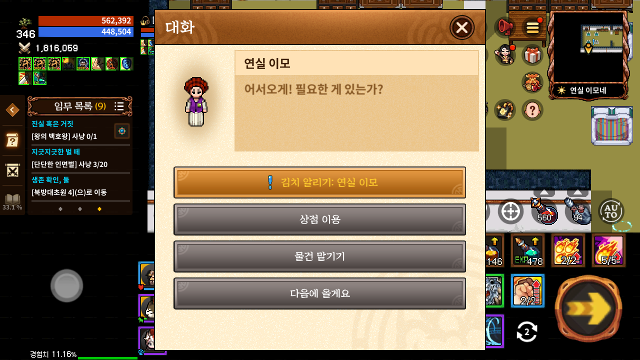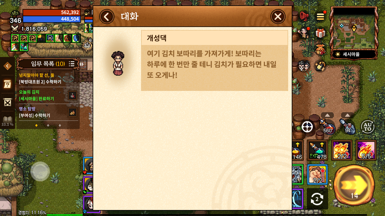 여기까지하면 매일매일 개성댁 아주머니에게 김치보따리를 받을 수 있는 일일퀘스트가 생성!