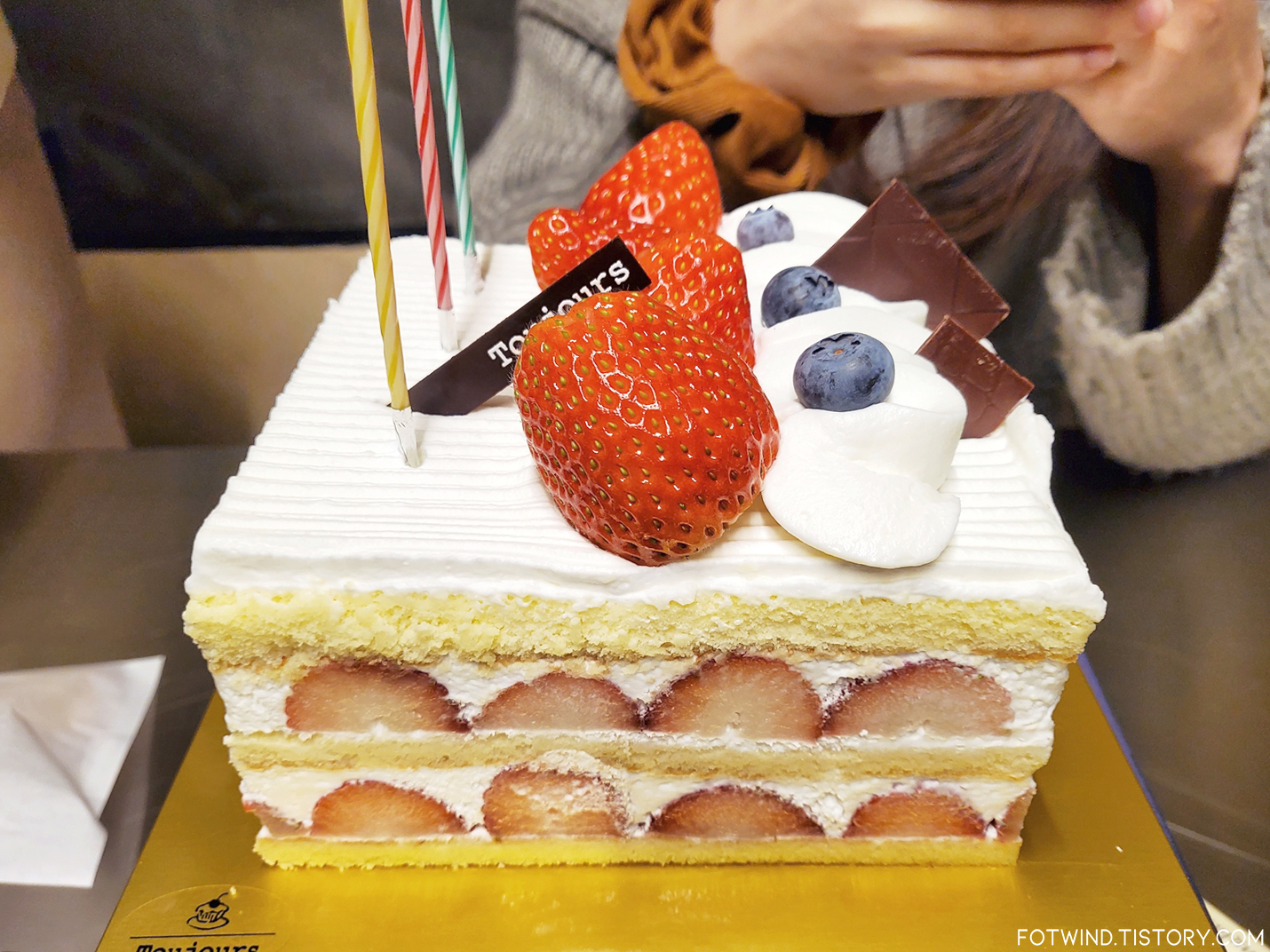 천안에서 유명한 빵집인 뚜쥬르의 케이크인데, 안에 딸기가 완전 꽉꽉 들어찼자너🙌