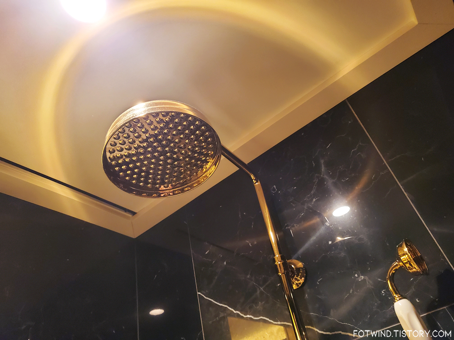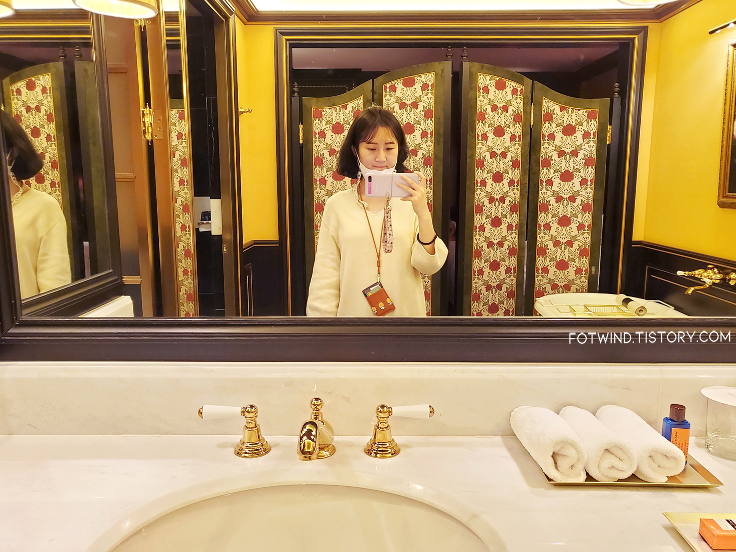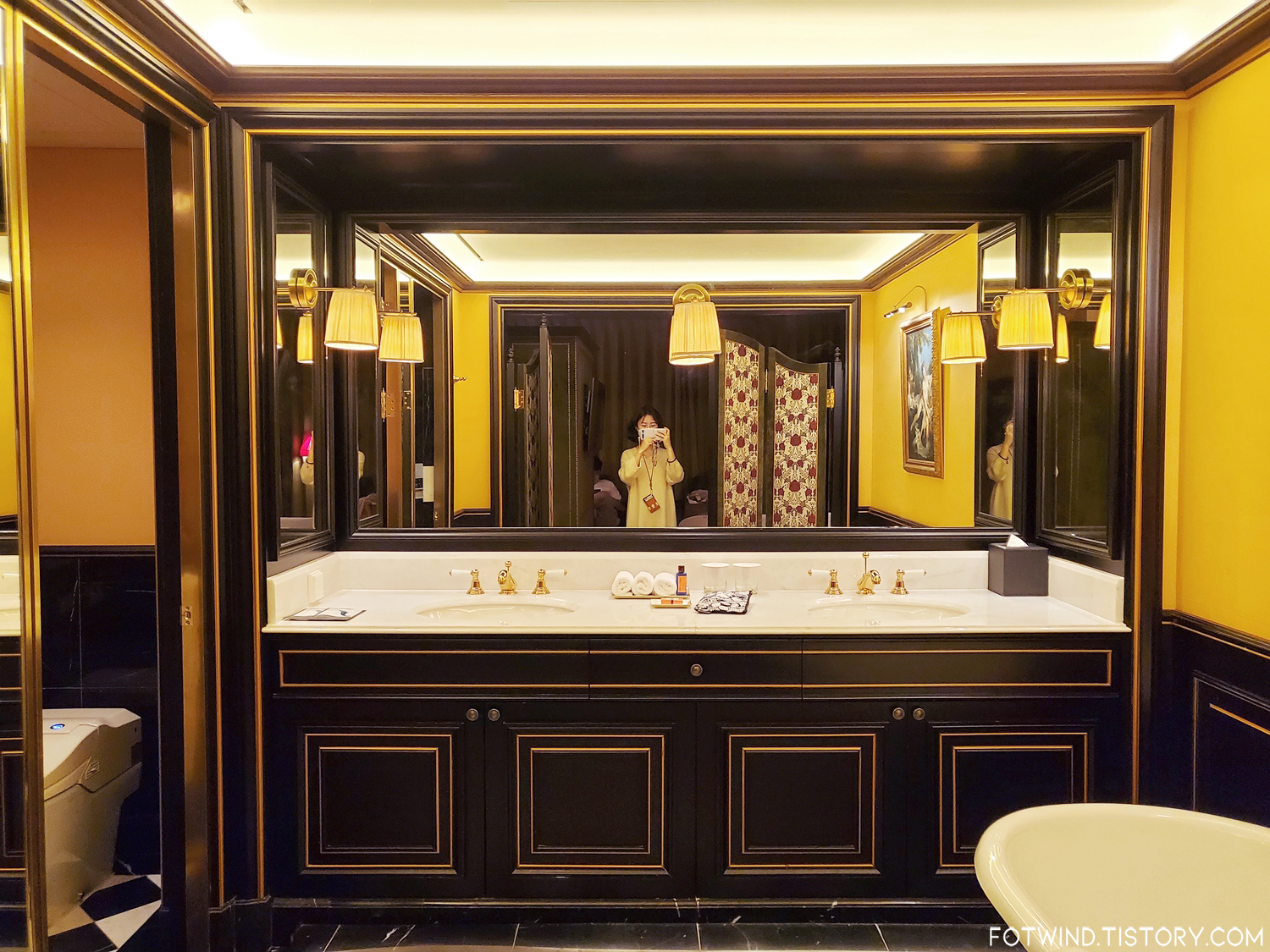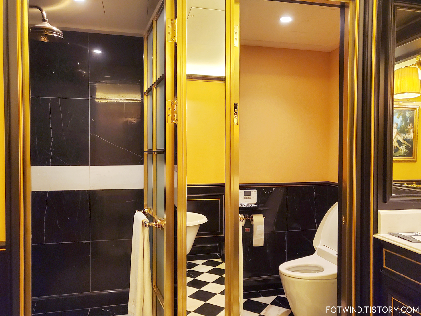 엄청 널찍한 공간에 화이트/골드로 깔끔하게 꾸며져있는 욕실