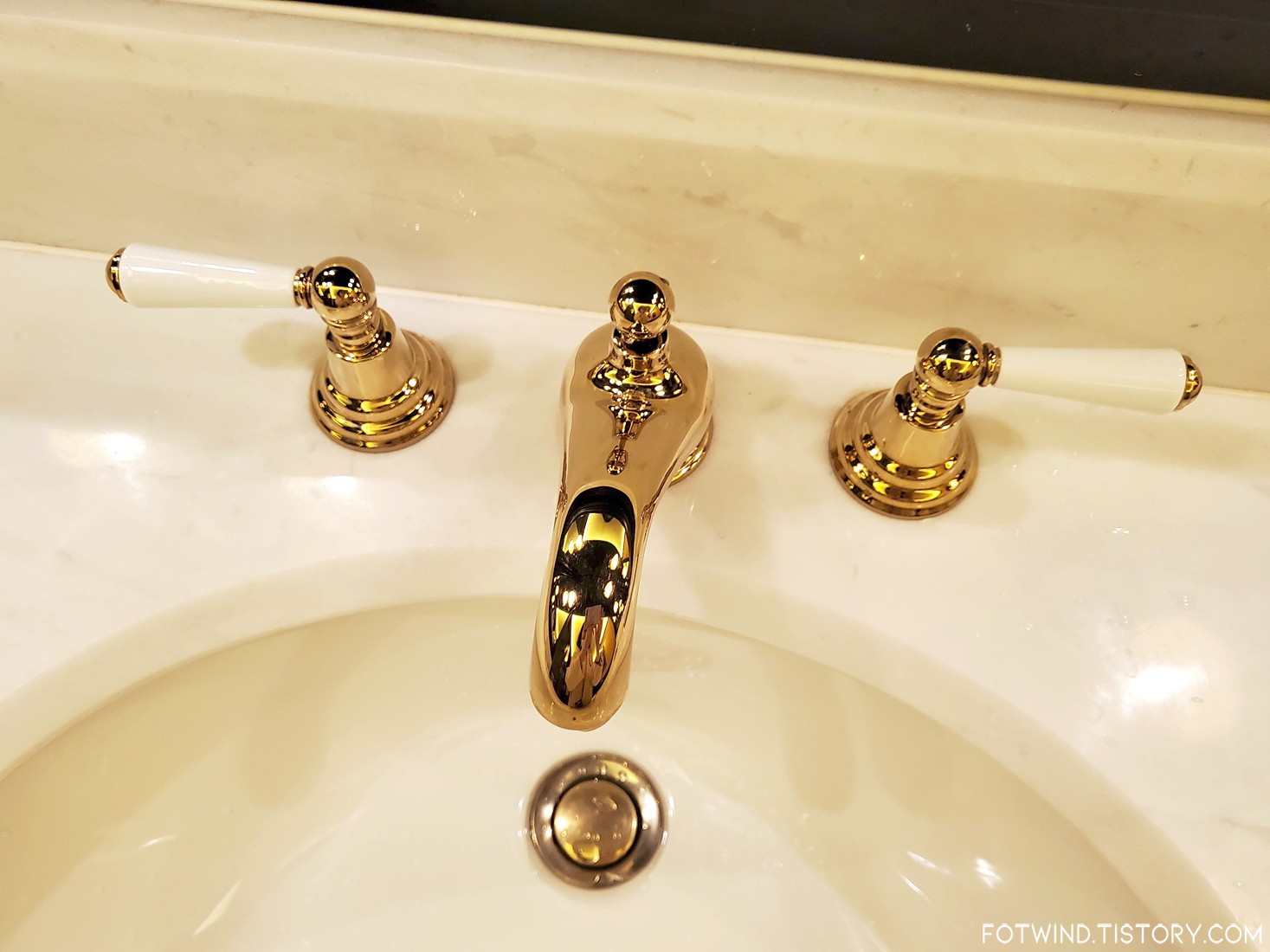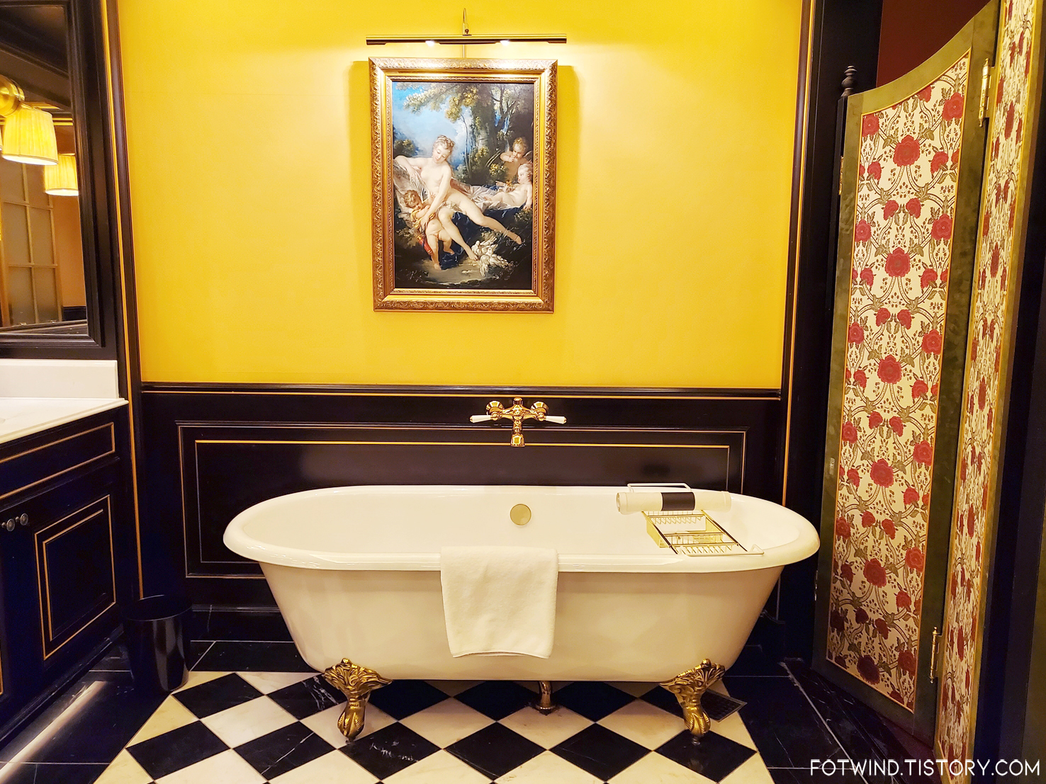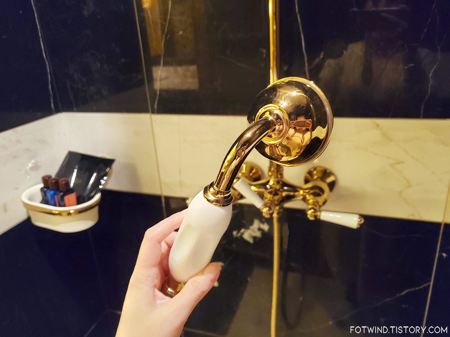 엄청 널찍한 공간에 화이트/골드로 깔끔하게 꾸며져있는 욕실