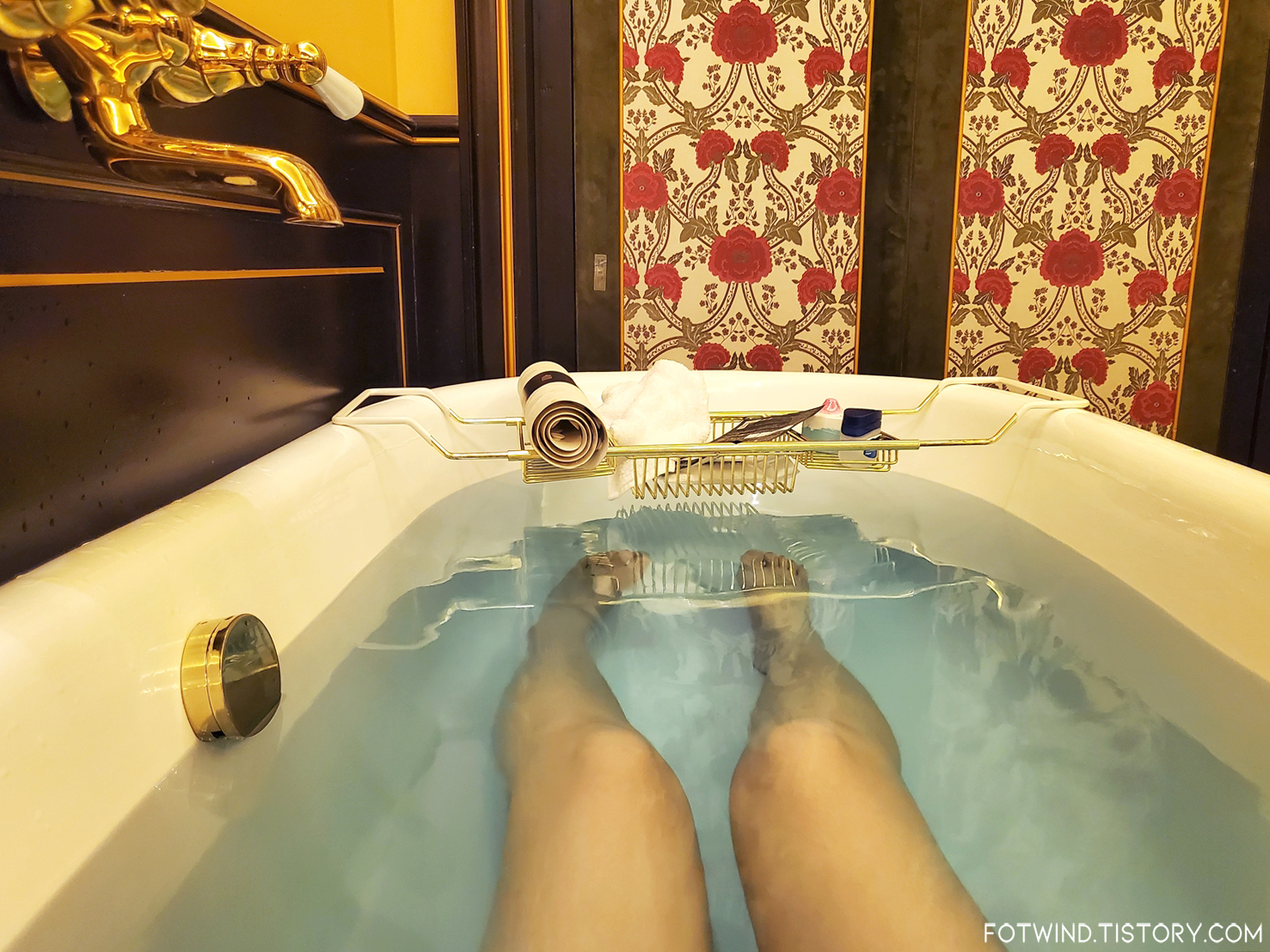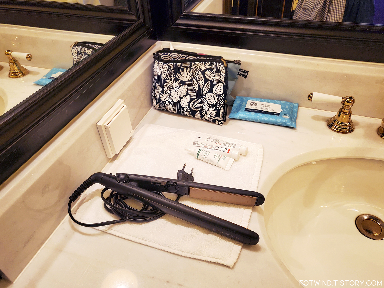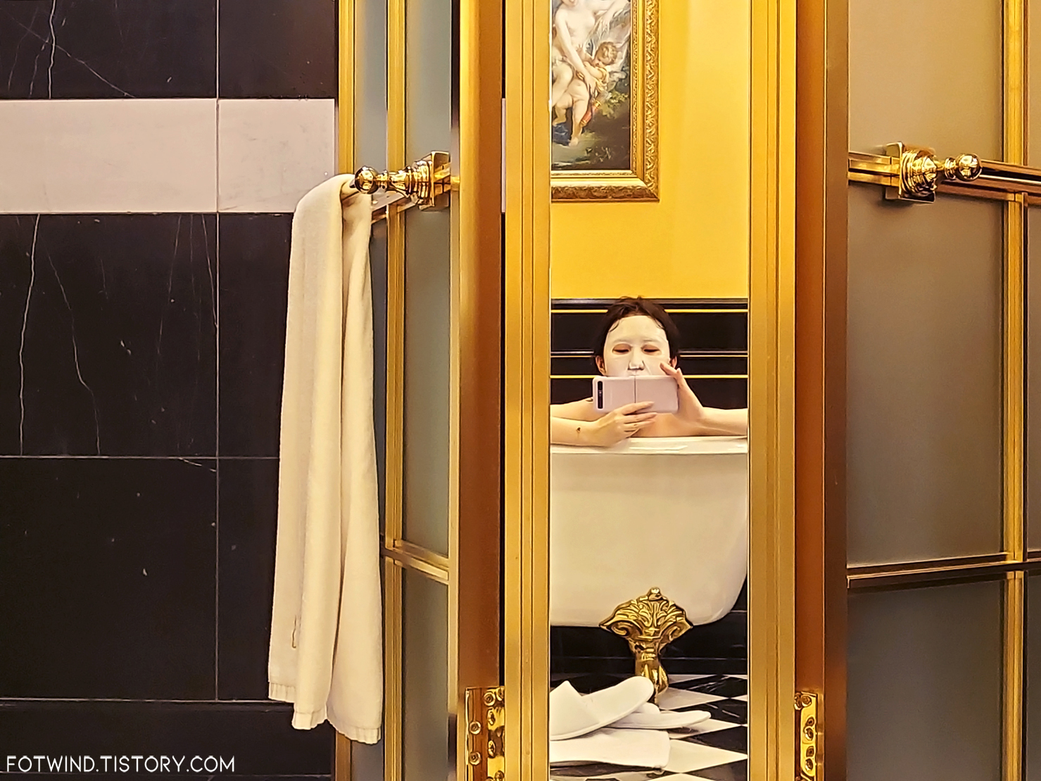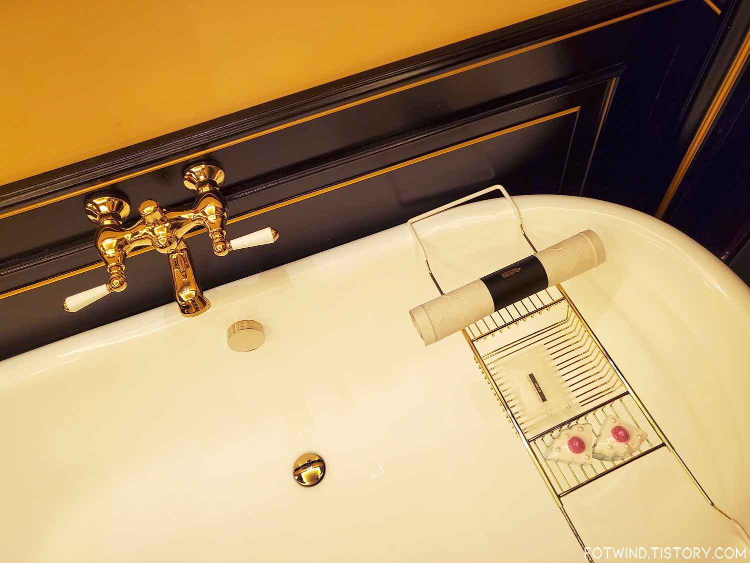 엄청 널찍한 공간에 화이트/골드로 깔끔하게 꾸며져있는 욕실