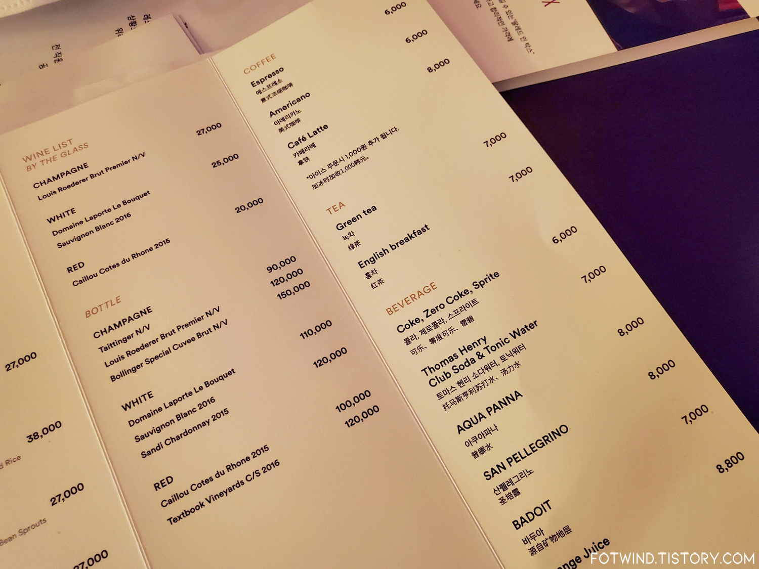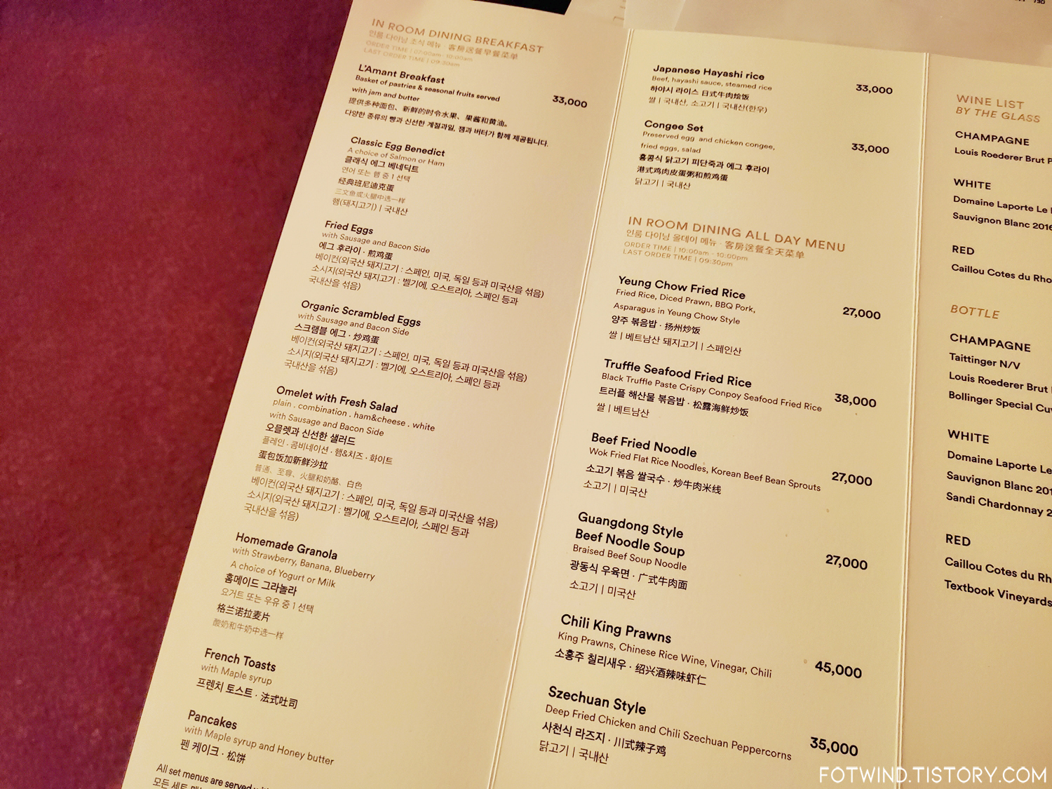 룸서비스 메뉴와 가격