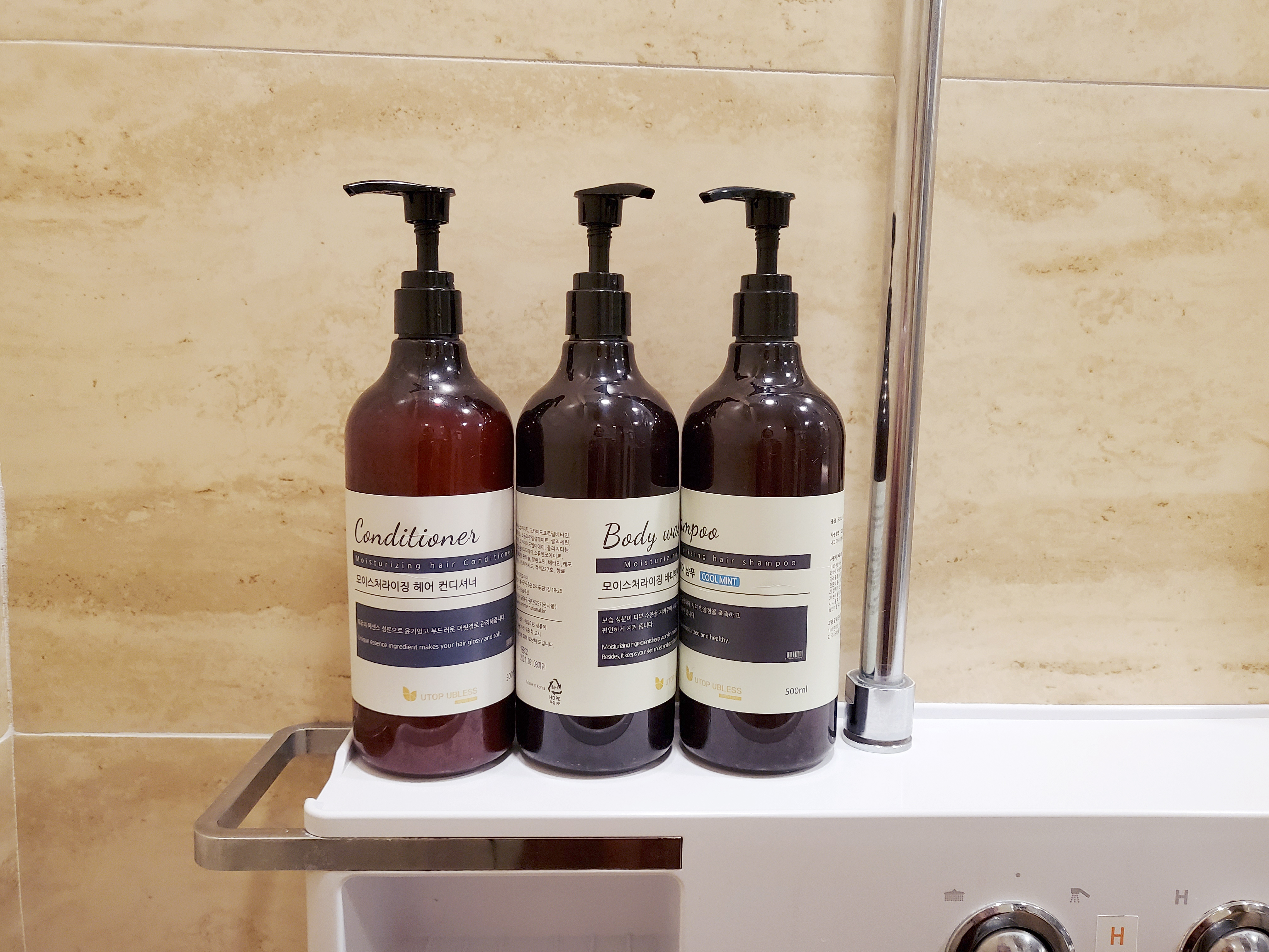 욕실 어메니티는 별다른 브랜드 없는 대용량제품들