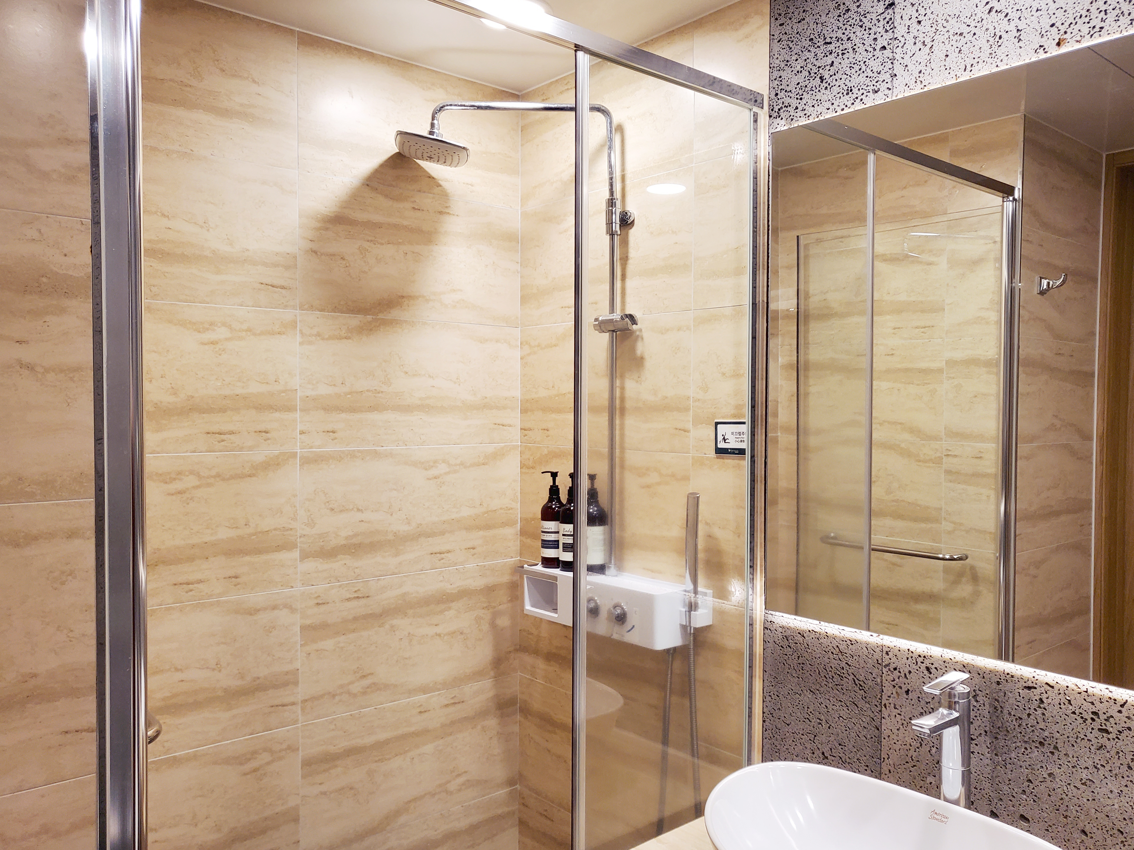 욕실은 세면대를 가운데 두고 왼쪽엔 샤워부스, 오른쪽엔 화장실이 있는 형태